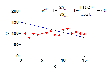 下面是一个简单的示例。 蓝色曲线是受限于当 X=0 时与 Y 轴在 Y=150 处具有截距的直线拟合结果。SSres 是红色数据点到这条蓝色曲线的距离平方和。SStot 是红色数据点到绿色水平线的距离平方和。由于 Sres 远大于 SStot,因此(蓝色曲线的)R² 值为负。