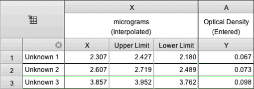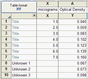 在同一表格中,将未知样本数据输入到标准样本下方。在这些行中输入仅含 Y 值的行(本示例所示),或仅含 X 值的行。可选地输入行标题以标注这些未知样本。