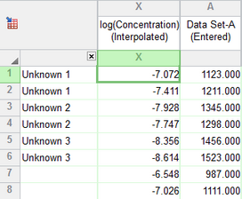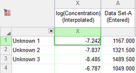 第一个选项卡“插值平均 X 值”显示您输入的 Y 值的平均值以及插值 X 值的平均值。X列显示与您输入的数据相对应的浓度(或浓度的对数)。