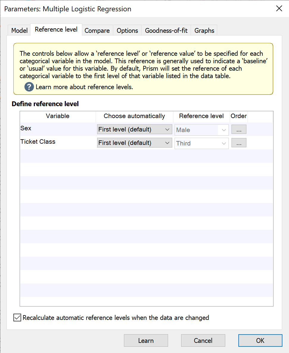 默认情况下,分类变量的参考级别被选定为数据表中该变量的第一个级别。Prism 还提供其他自动选项,包括“最后一个级别”、“最频繁级别”和“最不频繁级别”。但是,如果输入数据发生变化(或向输入数据表中添加了额外数据),其中一些自动选项也可能随之改变。 若要确保在输入数据发生变更或添加新数据时,指定的参考水平保持不变,请取消勾选“数据变更时重新计算自动参考水平”旁边的复选框,或通过相应的下拉菜单将各个参考水平设置为“自定义...”。