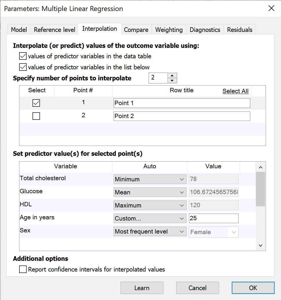 勾选此复选框后,Prism 允许您通过为每个预测变量指定数值来创建自定义插值点。使用上下箭头指定要添加用于插值的点数。在两个文本框的上方,可以为每个插值点添加名称/标签。