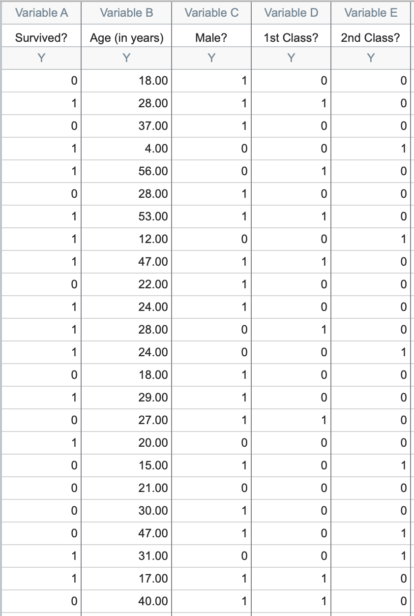 该示例数据共有五个列:“Survived?”、“Age (in years)”、“Male?”、“1st Class?” 和 “2nd Class?”。