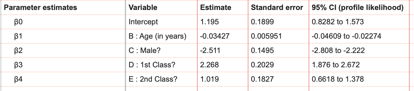 由于逻辑回归对数 odds 进行建模,因此这些参数的解读与线性回归略有不同。在尝试解读这些参数估计值之前,请确保您已掌握对数 odds、几率和概率之间的关系。在本示例中,我们可以看到“Male?”的估计值为 -2.511,而“1st class?”的估计值为 2.268。 这意味着,如果一名乘客是男性(其他所有变量保持不变),其生存的几率会减少2.511;而如果一名乘客乘坐头等舱(其他所有变量保持不变),其生存的几率会增加2.268。