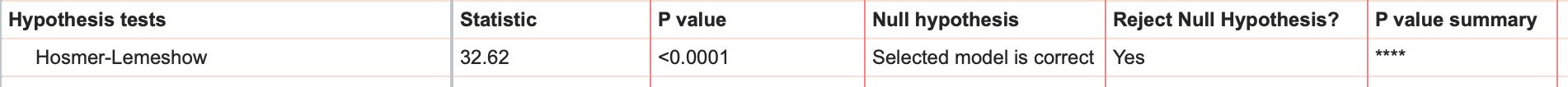若返回结果表的“表格结果”选项卡,我们可以继续探究多元逻辑回归报告的其他结果。默认情况下,结果的下一部分提供了Prism用于检验模型拟合数据优劣的两种方法之一。该检验被称为Hosmer-Lemeshow检验,用于检验“所选模型是正确的”这一零假设。 该检验的具体原理稍显复杂,但根据我们的数据,我们很可能选择拒绝“指定模型是正确的”这一零假设。