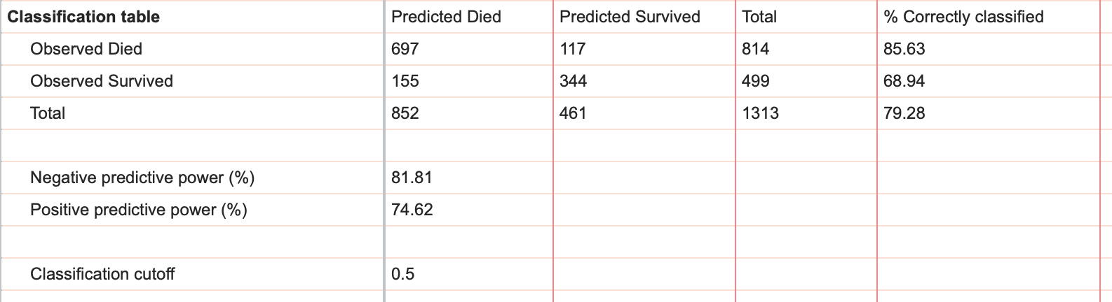 从该表格中,您可以快速查看观察到的死亡总数(814)、观察到的存活总数(499)、预测的死亡总数(852)以及预测的存活总数(461)。此外,该表格还提供了模型对每个观察到的存活和死亡案例的预测明细,以及被正确分类的观察到的存活和死亡案例所占的百分比。