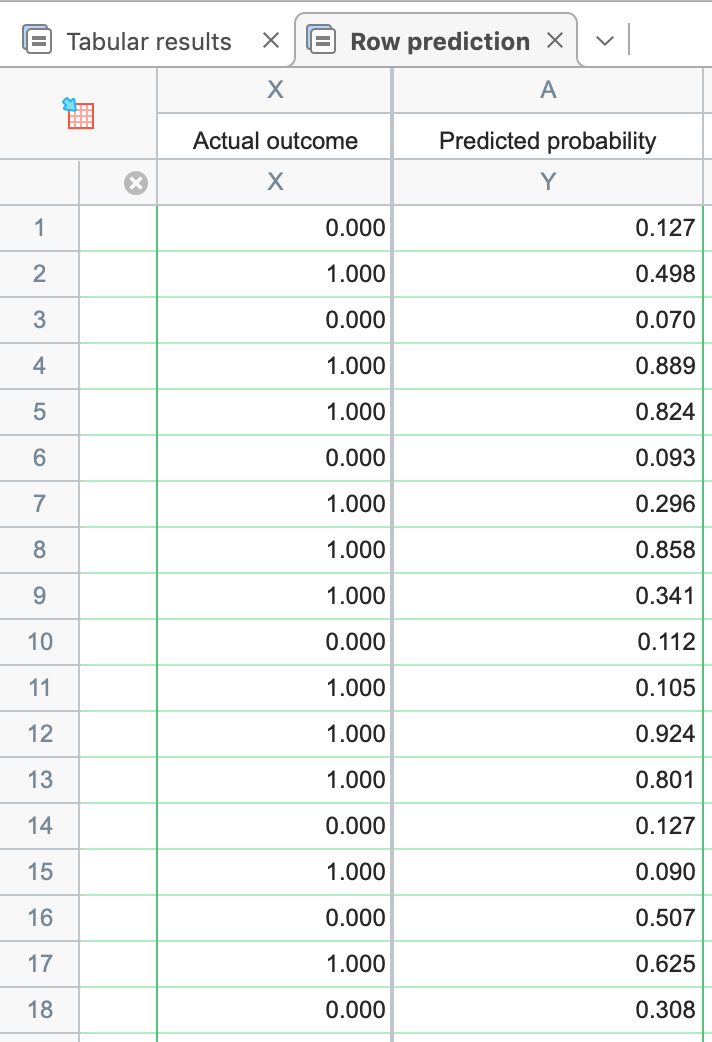 接下来要讨论的部分其实不在“主要结果”选项卡中。在主要结果表的顶部,您会看到一个名为“行预测”的选项卡。点击该选项卡后,Prism将提供所有观测值的完整预测概率列表,其中包含每个变量的完整信息: