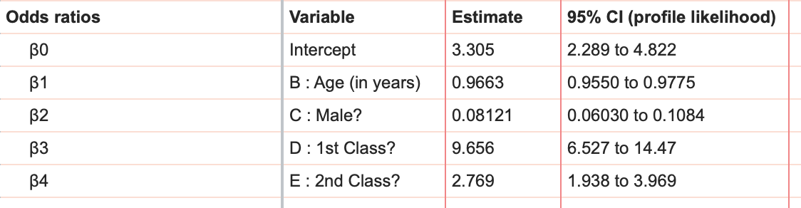 关于优势比的更详细解释可参见此处,但每个变量(β1、β2、β3 和 β4)的优势比告诉我们:该变量增加 1 单位,成功概率将乘以优势比的数值。 “年龄(以年为单位)”的优势比比报告为 0.9663。这意味着乘客年龄每增加一岁,其生存概率就会乘以 0.9663。由于该优势比小于 1,这意味着随着乘客年龄的增长,其生存概率实际上会下降(在其他所有因素保持不变的情况下)。