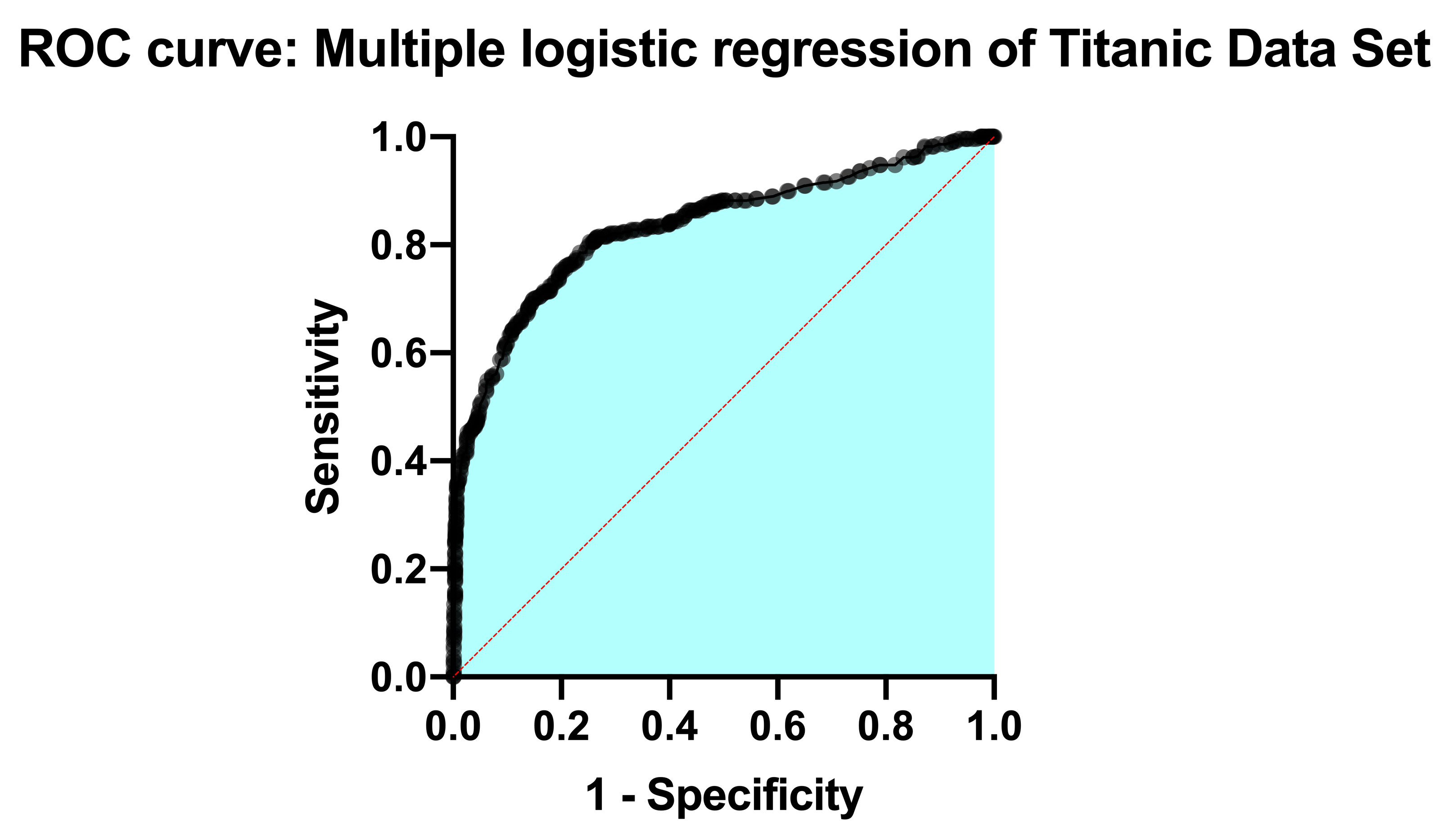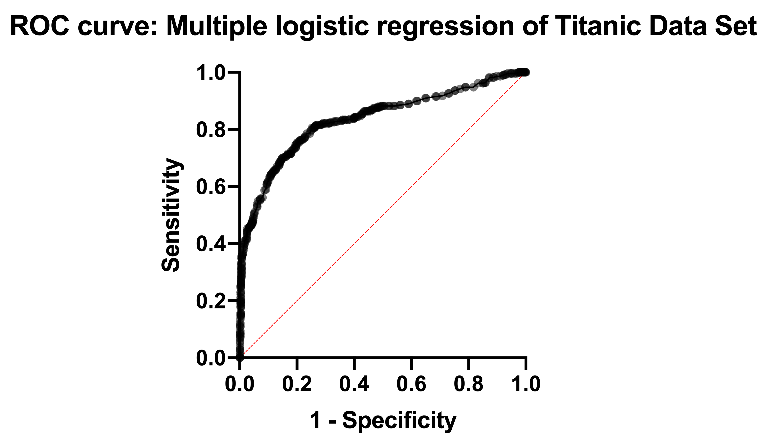 该表格提供了表中所有完整观察值的预测概率。这既包括数据中已拟合的观察值,也包括未输入Y值的观察值。在本示例中,我们可以设想一位假想的乘客:男性,34岁,持有二等舱机票。 令人惊讶的是,当前数据集中并不存在这样的乘客。不过,我们可以将这位假想乘客的对应值填入原始表格第 1315 行中的相应变量中,同时将“Survived?”(是否生还)单元格留空。由于“Survived?”单元格为空,将此行添加到表格中不会影响逻辑回归的大部分结果,但 Prism 会向您显示这位假想个体生还的预测概率。