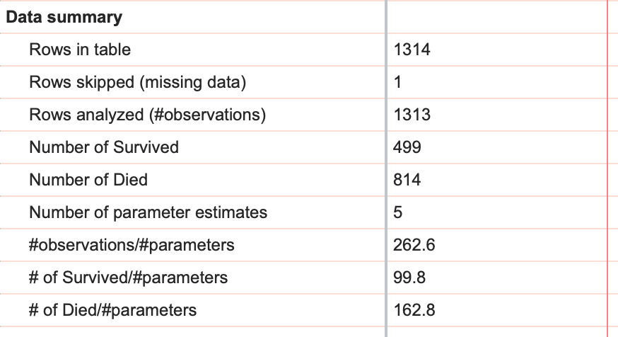 此外,在数据摘要中,1 的总数和 0 的总数分别显示为“幸存人数”和“死亡人数”。最后,提供了三个比率:观测值数与参数数之比、幸存人数与参数数之比,以及死亡人数与参数数之比(我们建议逻辑回归中后两个比率应至少为 10)。