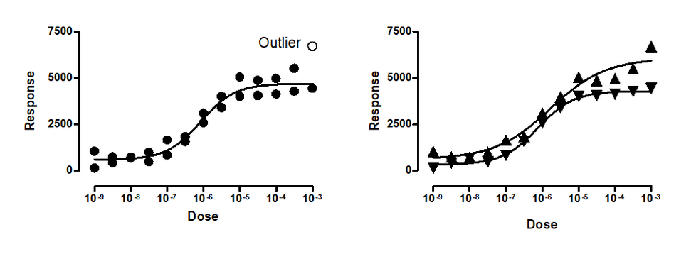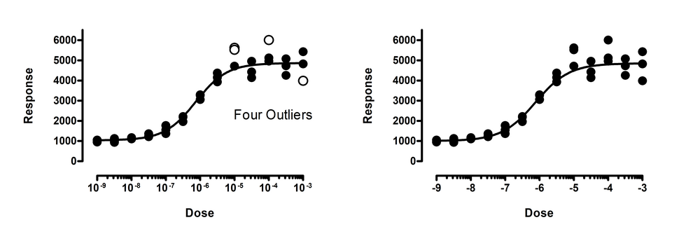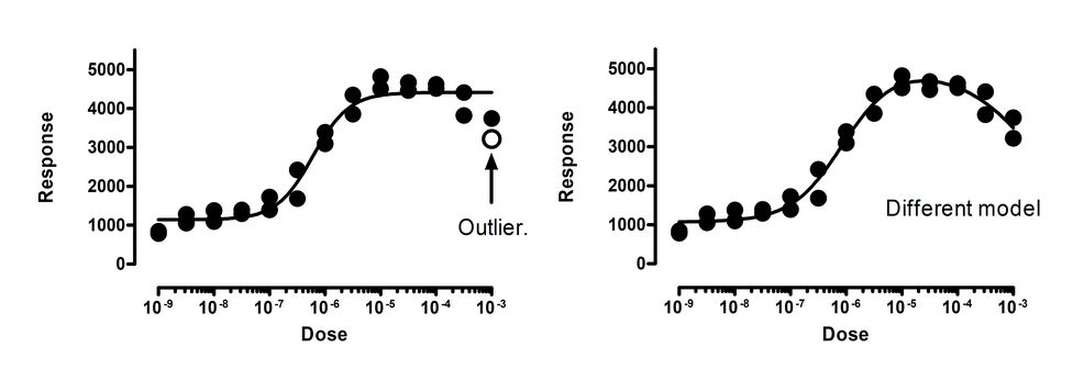 上图左侧展示了数据拟合于剂量反应曲线的结果。在此图中,其中一个数据点是一个显著的异常值。但这种解读的前提是您选择了正确的模型。右侧展示了数据拟合于另一种钟形剂量反应模型的结果,在此模型中,高剂量引发的反应比中等剂量更小。数据与该模型拟合得非常好,未检测到(甚至未怀疑)任何异常值。