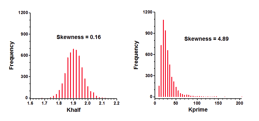 Khalf的分布非常对称,呈现高斯分布特征。因此,其偏度接近于零。相比之下,Kprime的分布则明显偏斜。需注意,部分模拟数据集的Kprime控制数据大于100。偏度值(4.89)证实了肉眼观察到的明显现象 - 该分布远非对称。