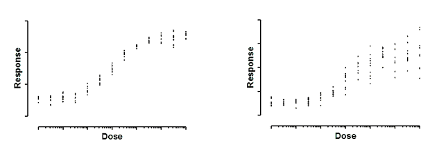 上图中的两幅图均显示了剂量-反应曲线,其中每个反应点均通过十个重复测量值来衡量。在左图中,这些重复测量值的标准差保持恒定,在整个曲线上大致相同。在右图中,重复测量值的标准差与Y值相关。随着曲线上升,重复测量值之间的变异性也随之增加。