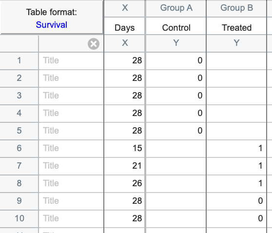 请注意,尽管五只对照组动物的观察时间(X值)相同,但每只动物都被输入到单独的一行中。这些行中的X值均为28(即观察天数),Y值为0(表示这些动物均被删剪)。 这些动物的观测数据被称为删剪数据,因为我们仅知它们存活了至少28天且未发生目标事件。由于研究结束,我们无法得知它们本可存活多久。