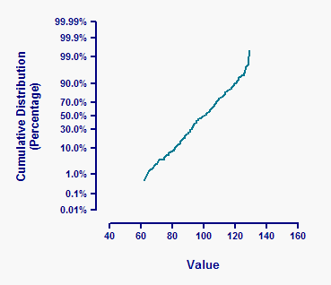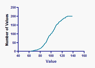 若选择以分数或百分比形式统计结果,Prism 还会在(频率分布参数对话框的底部)提供在概率轴上绘制的选项。若数据源自高斯分布,当累积分布在概率轴上绘制时,曲线将呈现线性特征。Prism 使用标准值标注 Y 轴,且无法调整这些标注。该图与 Q-Q 图非常相似。
