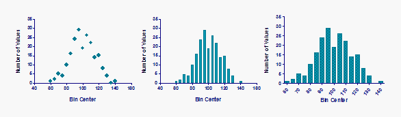 最后两种图表外观非常相似,但右侧的是条形图,而中间的是 XY 坐标图,其绘制的是条形或柱状图而非符号。中间的图表包含 X 坐标值,因此您可以对其拟合高斯分布。右侧的图表没有 X 坐标值(只有类别名称,恰好是数字),因此无法拟合曲线。