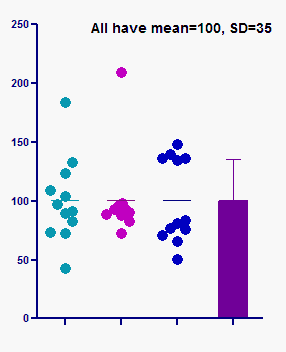 下图展示了三组数据集,它们的均值和标准偏差完全相同。左侧的样本近似服从正态分布。另外两组数据集虽远离正态分布,但均值(100)和标准偏差(35)却完全一致。