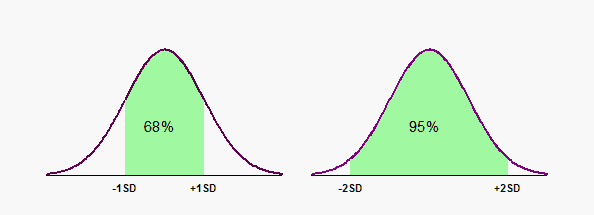 下图展示了标准偏差与高斯分布之间的关系。概率分布下的面积代表整个总体,因此概率分布某部分下的面积代表总体的一部分。在左侧图表中,绿色(阴影)部分从均值下方一个标准偏差延伸至均值上方一个标准偏差。 该绿色区域约占总面积的68%,因此略多于三分之二的数值位于均值上下一个标准偏差的区间内。右侧图表显示,约95%的数值位于均值上下两个标准偏差的范围内。