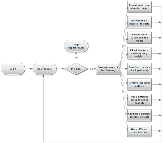 收集并分析一些数据。如果结果在统计学上不显著,但显示出与您预期方向一致的差异或趋势,那就再收集一些数据并重新分析。 或者尝试不同的分析方法:剔除几个异常值;进行对数转换;尝试非参数检验;通过标准化重新定义结果(例如除以每只动物的体重);采用一种在调整另一个变量差异的同时比较某个变量的方法;可能性不胜枚举。不断尝试,直到获得统计学显著的结果,或者直到资金、时间或好奇心耗尽为止。
