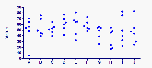 上图是通过模拟生成的。这十组数据集中的数值均通过随机抽样从一个均值为50、标准差为15的高斯分布中获取。但大多数人会认为数据集A中的最小值是异常值,或许数据集J中的最大值也是。大多数人无法理解随机波动,往往会过频地发现“异常值”。