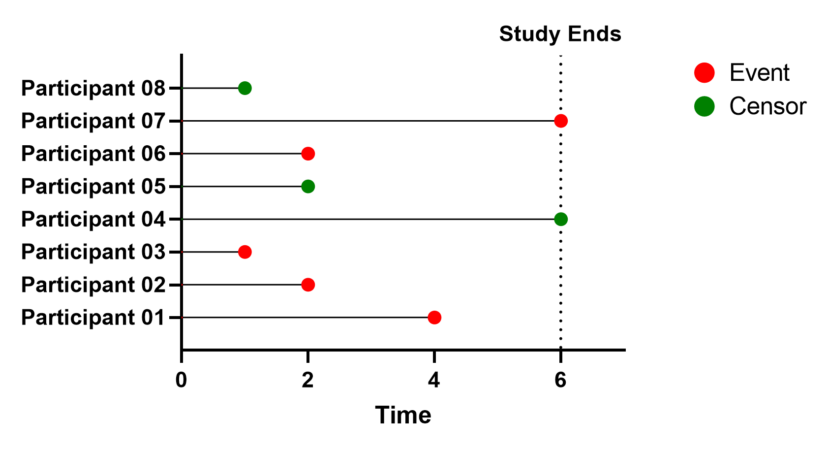 下图展示了研究中最初8名参与者的时间线,并标明了他们是否死亡(事件)或被删剪。