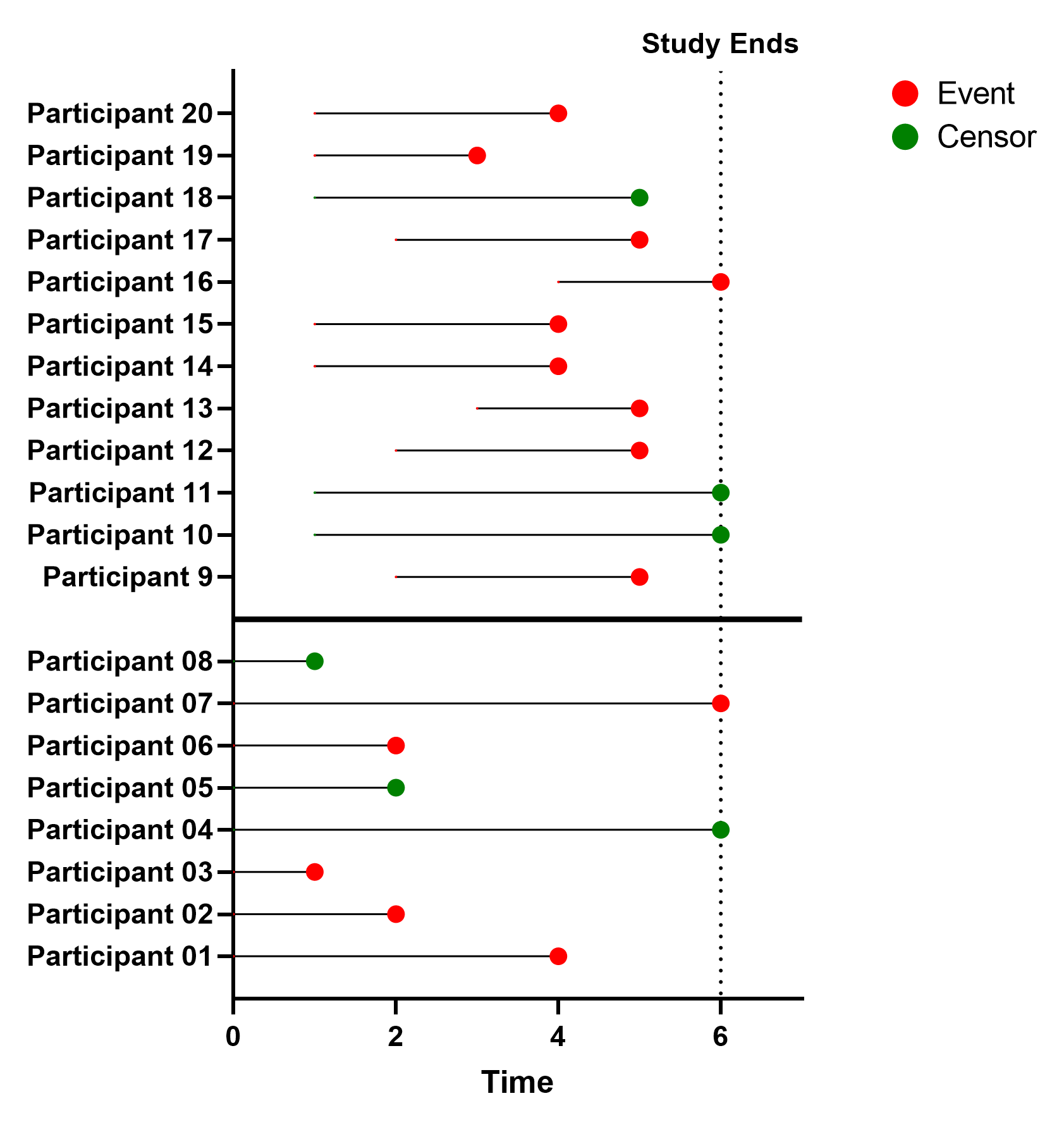 对于参与者04、05和08,我们无法确定他们在经历目标事件前经过了多长时间,仅能确定该事件必然发生在各自最后一次被观察之后。在这最初的八名参与者中,我们只能指出其中五人经历了目标事件,而其余三人则被删剪。