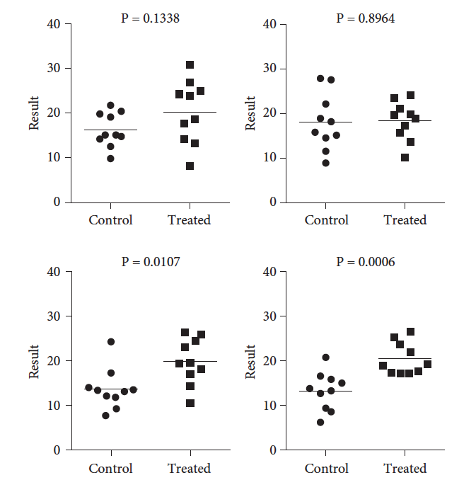 为了说明这一点,我使用GraphPad Prism进行了一些模拟。我从两个标准差均为5.0的高斯总体中进行抽样。这两个总体的均值相差5.0。以下是四次模拟实验的结果。这四次实验仅在随机抽样方面有所不同。这四个P值却存在显著差异。