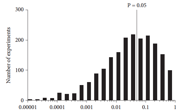 如果零假设成立,那么P值的分布是均匀的。一半的P值将小于0.50,5%的P值将小于0.05,以此类推。