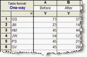 将各组的数据分别输入到不同的列中,配对的数值应位于同一行。若存在缺失值,该行将被忽略。可选:输入行标签以标识每行数据的来源(例如受试者的姓名首字母)。