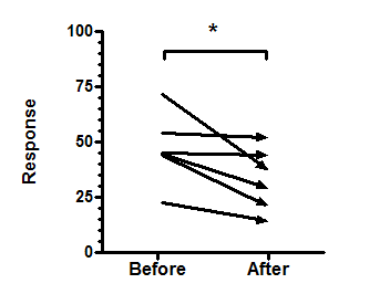 •“前后”对比图应完整呈现所有数据。本示例将每位受试者绘制为箭头,以清晰展示从“前”到“后”的变化方向,但您也可以选择仅绘制线条,或在线条上添加符号。