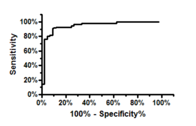 在 ROC 对话框中,指定哪些列包含对照组和患者的结果,并选择以分数或百分比形式显示结果(灵敏度和特异性)。请务必勾选“创建新图表”选项