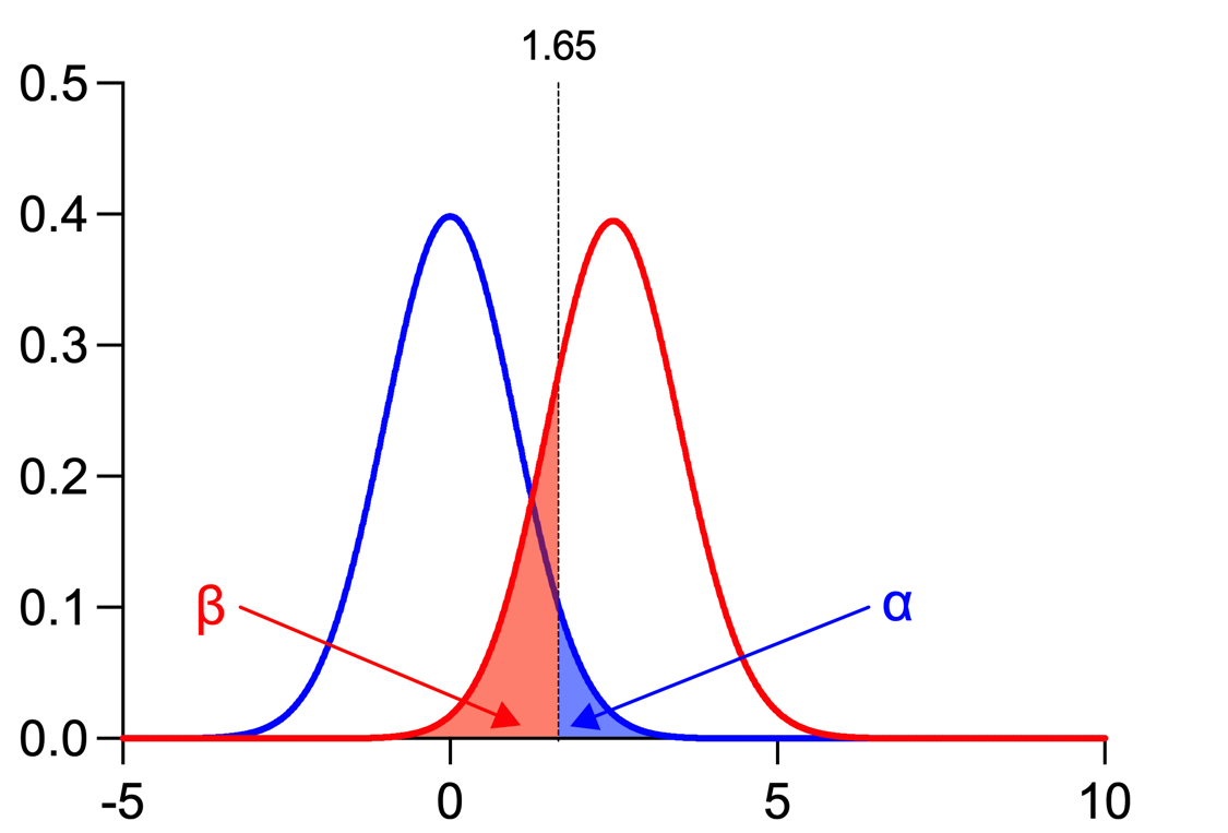 在此情况下,阴影区域代表当备择假设成立时,t统计量值小于临界值的概率。 此处的阴影区域占该曲线下总面积的20%。这体现了β的概念,即当零假设为假时未能拒绝零假设的概率(第二类错误)。换言之,即实际存在效应时未能检测到该效应的概率。 您可能会注意到,α(犯Ⅰ类错误的概率)是β(犯Ⅱ类错误的概率)的1/4,这些数值相当常见。一种理解方式是:采用这些数值意味着,避免犯Ⅰ类错误(假阳性)的重要性是避免犯Ⅱ类错误(假阴性)的4倍。