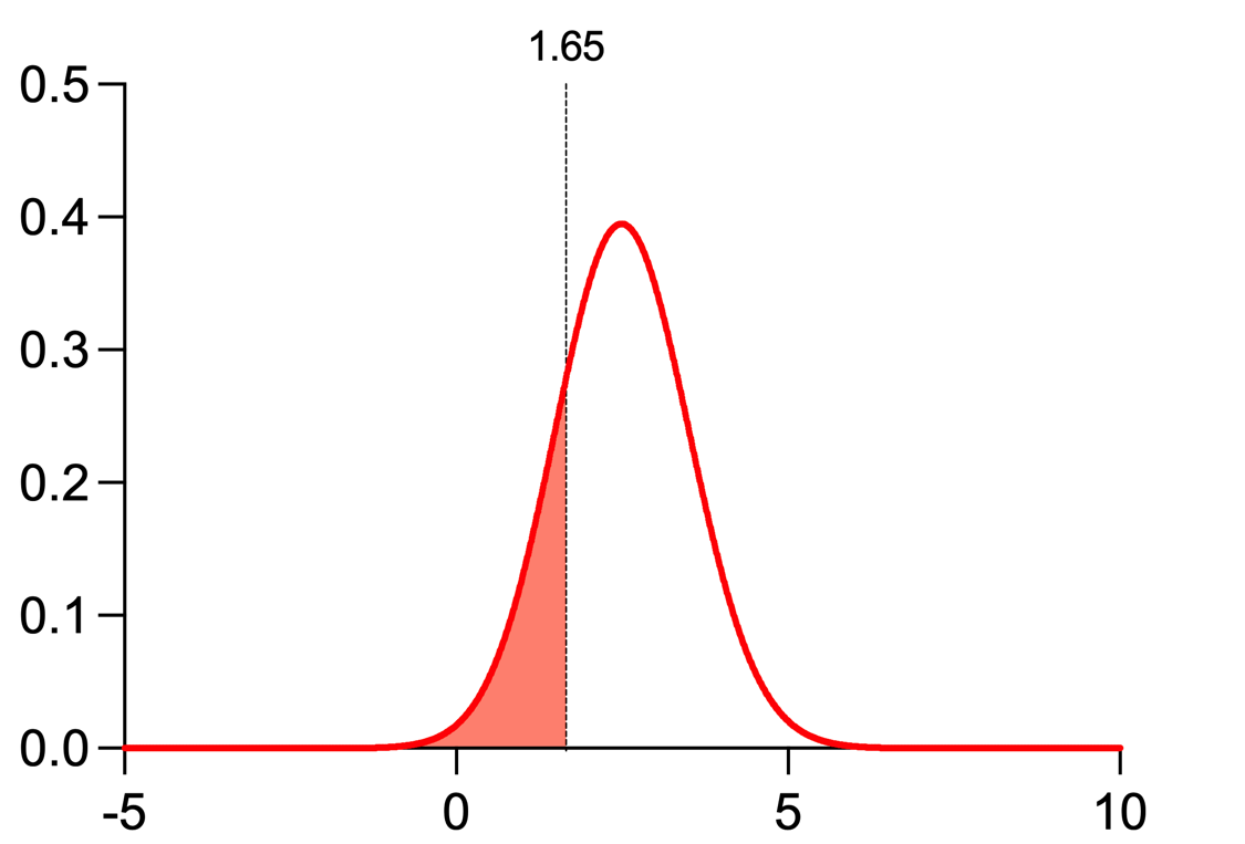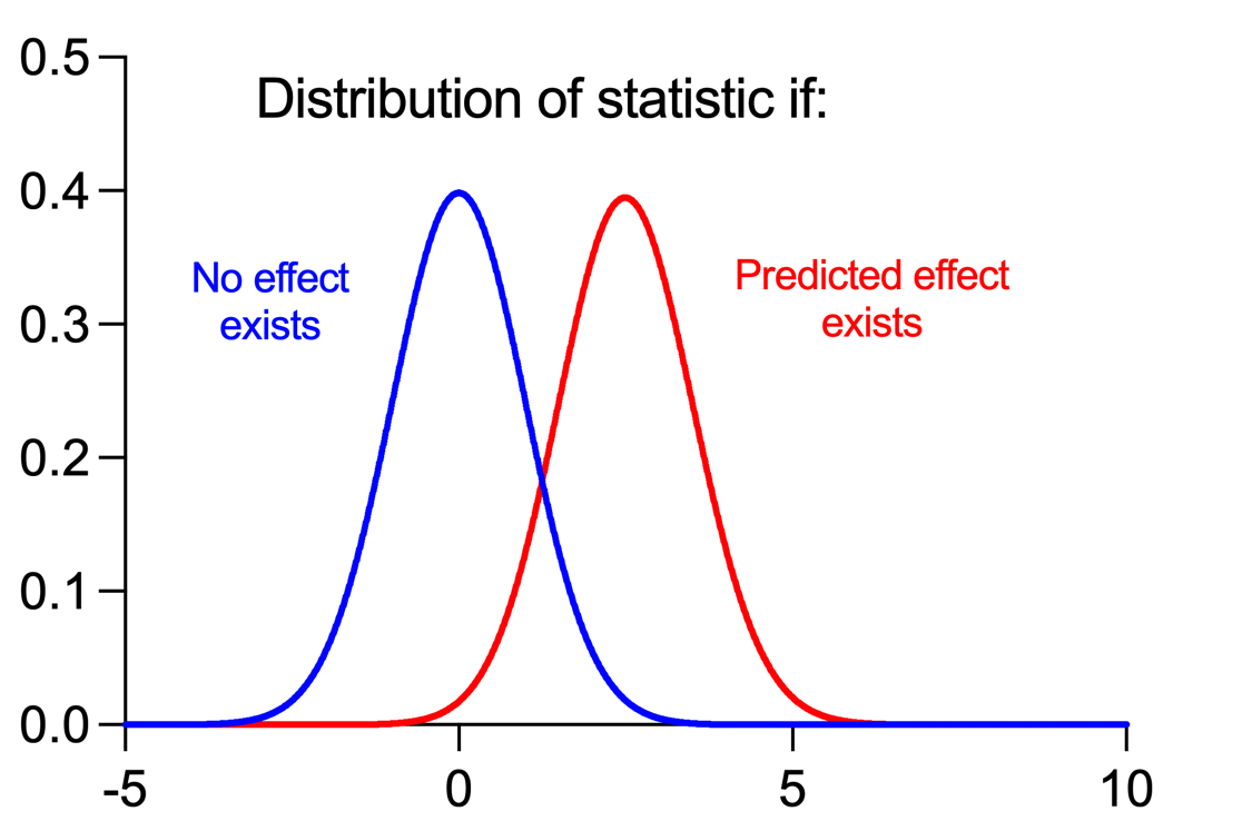 红色曲线是假设存在特异性预测效应时的抽样分布。在此情况下,该分布的中心点约为2.5。这是因为如果预测效应确实存在,测得的t统计量远离零点的概率会大得多(但并非不可能为零)。