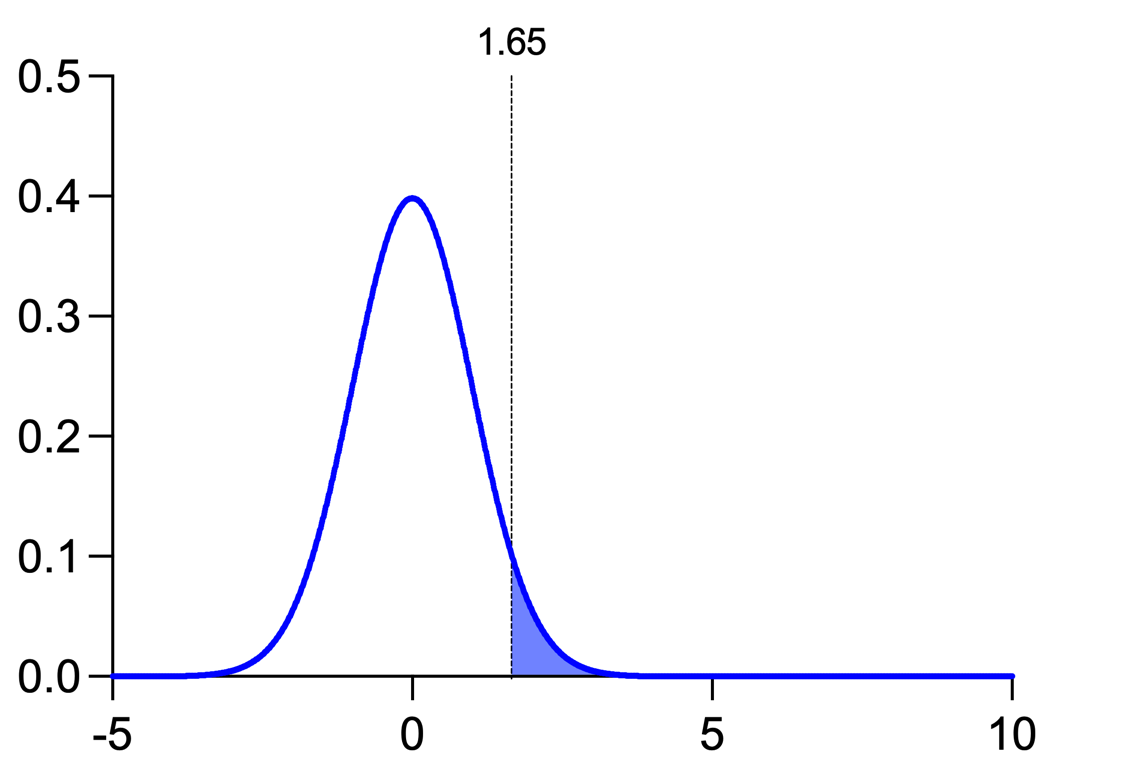 阴影区域代表在零假设成立的情况下,得到大于临界值的 t 统计量值的概率。在此情况下,阴影区域占该曲线下总面积的 5%。这体现了 α 的概念,即当零假设实际上成立时,拒绝零假设的概率。 若采用不同的α值,将得到不同的临界值,最终阴影区域所占的曲线长度也会随之改变。