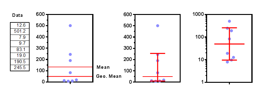上例展示了八个数值(因此,如果您愿意,可以自行进行计算)。几何均值为 49.55,几何标准差因子为 5.15。左图显示了数据,其中线条分别表示算术均值和几何均值。中间图展示了 Prism 如何绘制几何均值和几何标准差。 上误差条延伸至几何均值乘以几何标准差因子(49.55 * 5.15 = 255.2)。 下方的误差条向下延伸至几何均值除以几何标准差因子(49.55 / 5.15 = 9.62)。右侧图表展示了数据、几何均值和几何标准差在对数轴上的绘制情况。在对数轴上,对数标准差误差条在视觉上呈现对称分布,尽管从数值上来看它们实际上非常不对称。