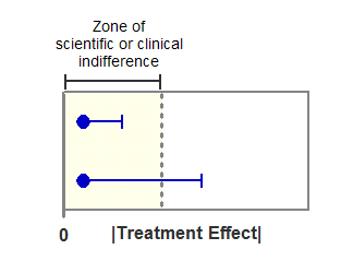下图展示了利用置信区间检验等效性的逻辑。横轴表示治疗效应的绝对值(平均反应值之间的差异)。实心圆表示观察到的效应,其位于无差异区内。水平误差条表示单侧95%置信区间,该区间显示了与数据一致的最大治疗效应(置信度为95%)。