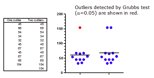 Grubbs 异常值检验的结果令人惊讶。该检验(设显著性水平为 5%,但设为 1% 时结果相同)确实识别出了左侧数据集中的异常值。这并不意外。但 Grubbs 检验在右侧数据集中却未发现任何异常值。第二个异常值的存在阻碍了异常值检验发现第一个异常值。这种现象被称为掩蔽效应。