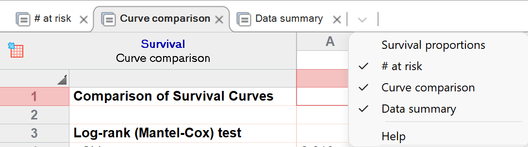 Kaplan-Meier生存分析的主要结果之一是各时间点的生存率或百分比。这些数值通常以图表形式呈现,但有时查看这些结果的表格也很有帮助。默认情况下,显示这些数值的“分析结果”选项卡是隐藏的。要查看它,只需点击分析选项卡右侧的下拉菜单,然后从列表中选择即可。